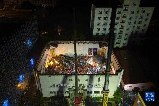 7月24日,消防救援人員在齊齊哈爾市第34中學體育館樓頂坍塌事故現場救援。新華社記者 張濤 攝