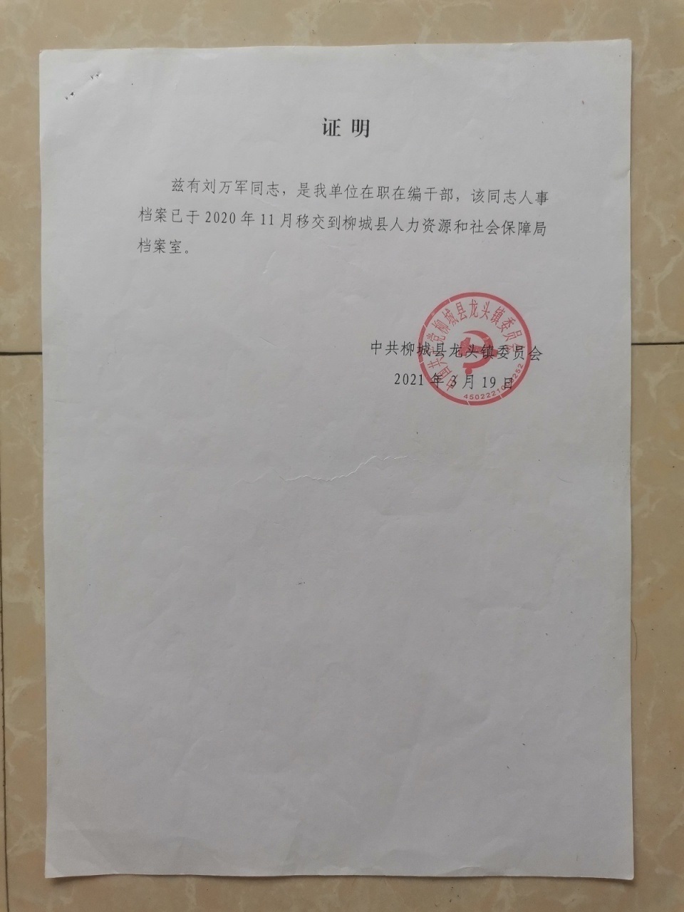 經(jīng)查,劉某某現(xiàn)為柳城縣龍頭鎮(zhèn)鄉(xiāng)村建設(shè)綜合服務(wù)中心事業(yè)單位退休工勤人員。其先后在柳城縣西安鄉(xiāng)、太平鎮(zhèn)、龍頭鎮(zhèn)工作,2022 年1月退休前為柳城縣龍頭鎮(zhèn)事業(yè)單位工勤人員。由于工作調(diào)動(dòng),在檔案移交過(guò)程中,不慎造成部分檔案缺失。