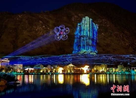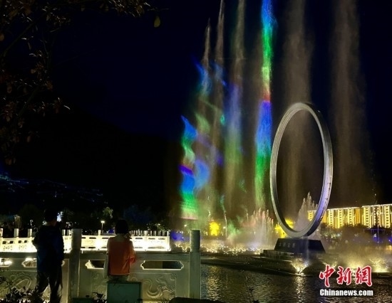 音樂(lè)水秀噴泉位于工布公園人工生態(tài)湖中。