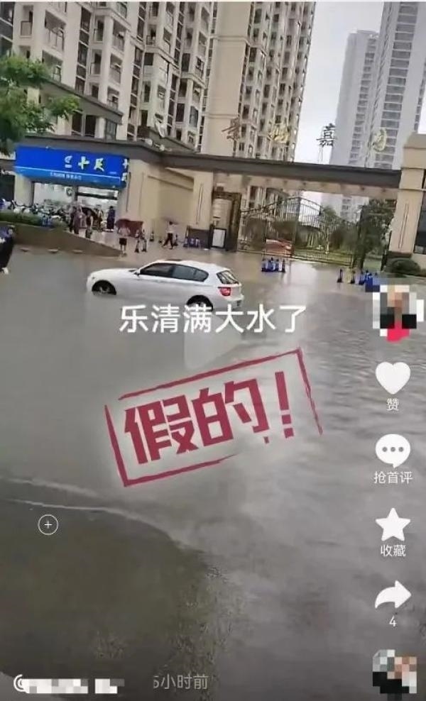 巡查還發(fā)現(xiàn)有網(wǎng)民發(fā)布視頻,標(biāo)有文字“樂清滿大水了”,內(nèi)容可見有小區(qū)門口積水嚴(yán)重,在道路停放的幾輛汽車被淹至車身一半。經(jīng)核實(shí),該視頻并非發(fā)生在樂清。發(fā)布視頻的網(wǎng)民陳某某(男,43歲)為吸引眼球捏造事實(shí),在某平臺賬號發(fā)布,造成負(fù)面影響,已被警方依法給予行政處罰。