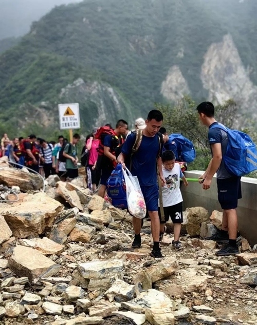10多個消防官兵專門護送他們撤離,走過懸崖邊時,消防官兵拿桿子擋在外面,再用身體連成一堵墻,以防他們掉下去。有的學(xué)生邊走邊說,“這次回去寫作文的素材有了,這才是真正的大場面。”