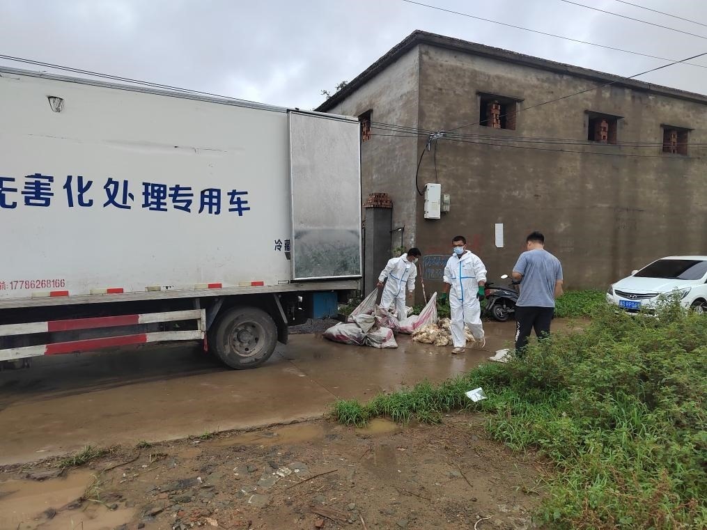 河北省雞澤縣一家蛋雞養(yǎng)殖場門口,專業(yè)人員對養(yǎng)殖場內淹死的蛋雞進行集中收集裝車。(雞澤縣農業(yè)農村局供圖)