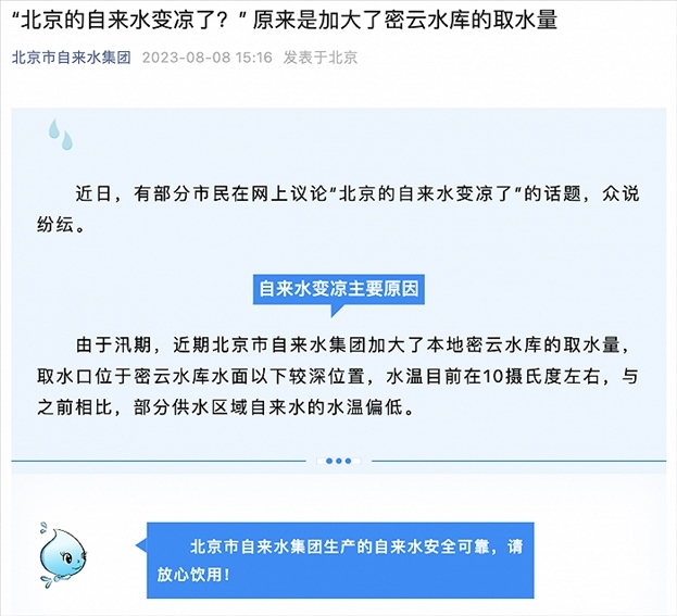 央視網(wǎng)消息:近日,有部分市民在網(wǎng)上議論“北京的自來水變涼了”的話題。北京市自來水集團8月8日通過其公眾號回應,由于汛期,近期北京市自來水集團加大了本地密云水庫的取水量,取水口位于密云水庫水面以下較深位置,水溫目前在10攝氏度左右,與之前相比,部分供水區(qū)域自來水的水溫偏低。
