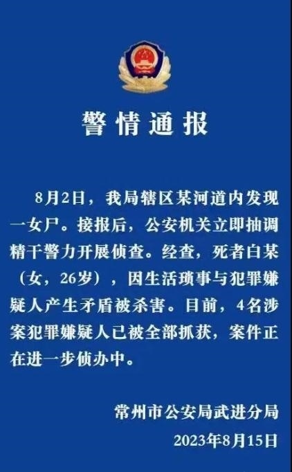 ·警方通報(bào)江蘇常州一女子被分尸:4名嫌疑人為兩男兩女,均已落網(wǎng)。