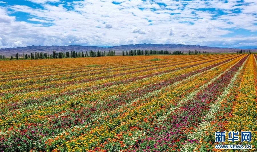 位于天山腳下的新疆昌吉回族自治州呼圖壁縣石梯子鄉(xiāng)白楊河村600畝百日草花開(kāi)成海,吸引眾多游客前來(lái)賞景拍照。