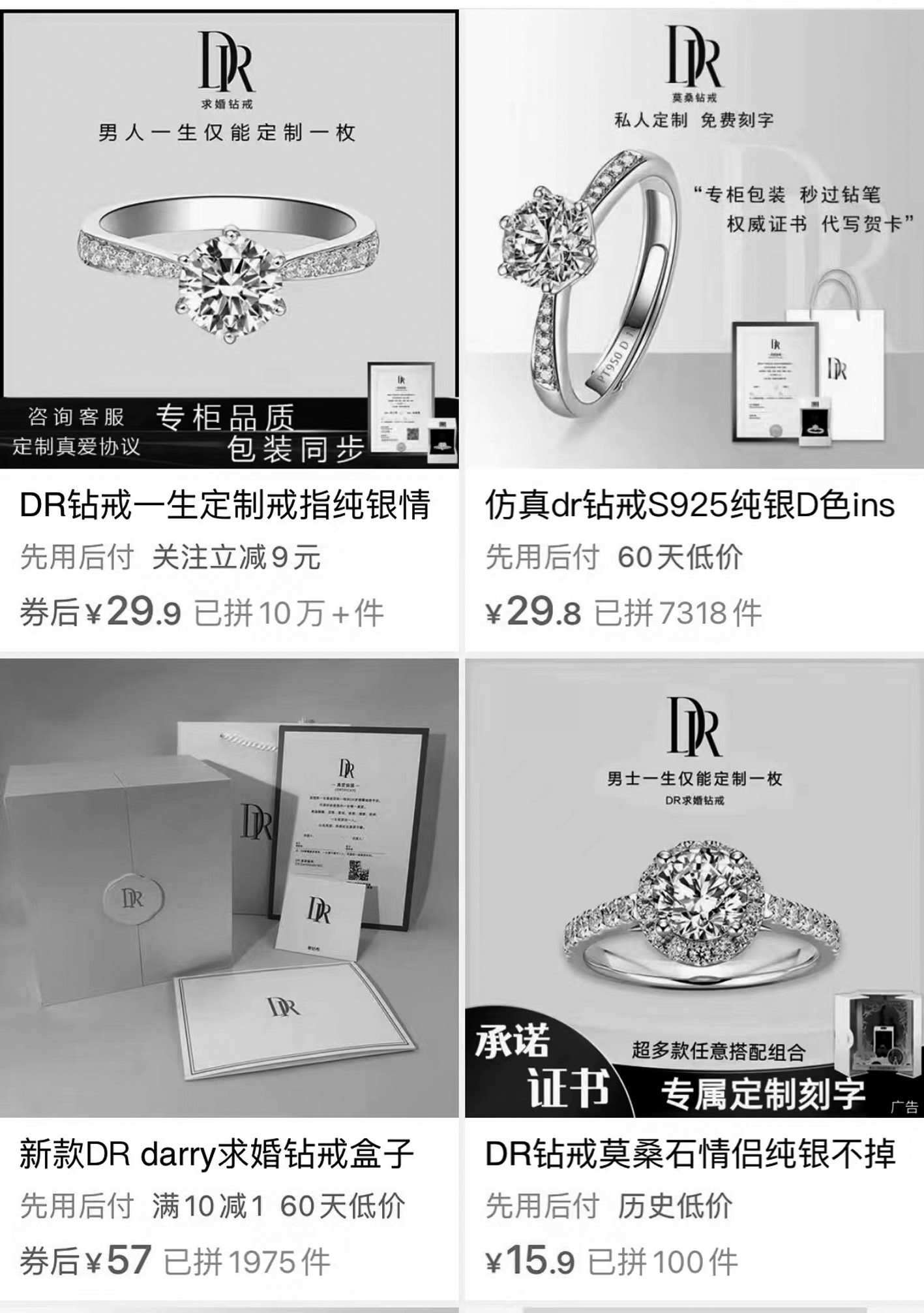 記者在一家電商平臺輸入“DR鉆戒”,映入眼簾的商品售價(jià)只要幾十塊,幾乎都把“男士一生僅能定制一枚”作為賣點(diǎn)。還有商家寫道,“專柜品質(zhì)、包裝同步”“咨詢客服定制真愛協(xié)議”。