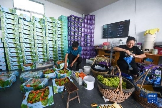 8月20日,在諸暨市姚江鎮(zhèn)紫草塢村阿群家庭農(nóng)場(chǎng)內(nèi),種植戶(hù)打包成熟的葡萄,準(zhǔn)備運(yùn)往市場(chǎng)。