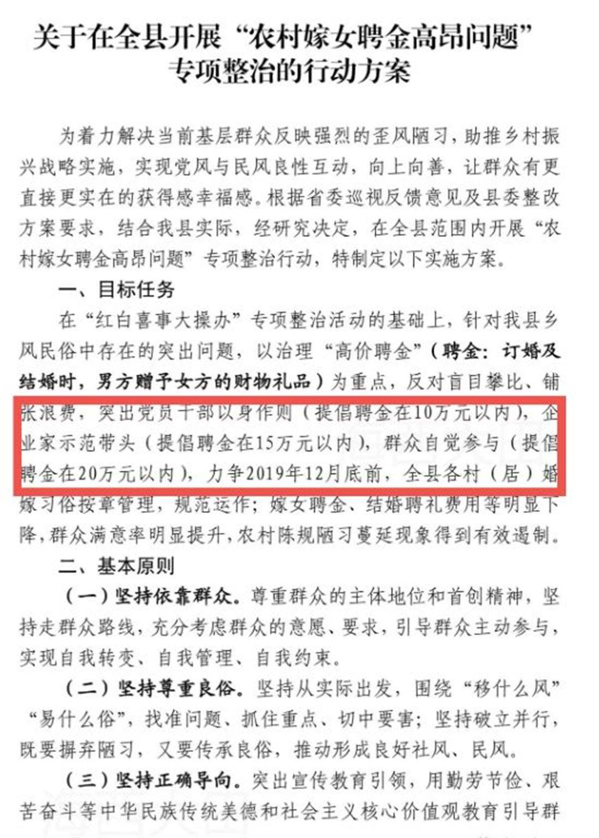 2019年5月,大田縣委辦公室就印發(fā)《關(guān)于在全縣開展“農(nóng)村嫁女聘金高昂問題”專項整治的行動方案》的通知。方案內(nèi)容有,針對該縣鄉(xiāng)風(fēng)民俗中存在的突出問題,以治理“高價聘金”為重點,反對盲目攀比、鋪張浪費,突出黨員干部以身作則(提倡聘金在10萬元以內(nèi)),企業(yè)家示范帶頭(提倡聘金在15萬元以內(nèi)),群眾自覺參與(提倡聘金在20萬元以內(nèi)),力爭在2019年12月底前,結(jié)婚聘禮費用等明顯下降。