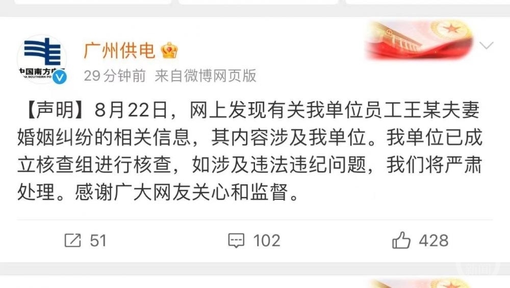 8月22日晚間,廣州供電局官方社交賬號發(fā)布聲明稱:“8月22日,網(wǎng)上發(fā)現(xiàn)有關我單位員工王某夫妻婚姻糾紛的相關信息,其內(nèi)容涉及我單位。我單位已成立核查組進行核查,如涉及違法違紀問題,我們將嚴肅處理。感謝廣大網(wǎng)友關心和監(jiān)督?!?/p>
