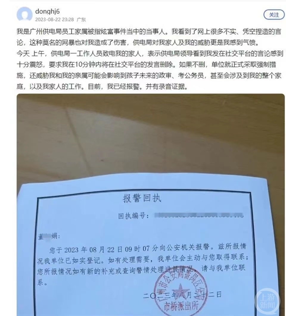 22日晚23時,自稱是舉報當事人阿娟的網(wǎng)友發(fā)布了報警回執(zhí),并發(fā)帖稱當日上午,供電局一工作人員致電她的家人,“表示供電局領導看到我發(fā)在社交平臺的言論感到十分震怒,要求我在10分鐘內(nèi)將在社交平臺的發(fā)言刪除。如果不刪,單位就正式采取強制措施,還威脅我和我的親屬,(此舉)可能會影響到孩子未來的政審、考公務員,甚至會涉及到我的整個家庭,以及我家人的工作。目前,我已經(jīng)報警。并有錄音證據(jù)?!?/p>