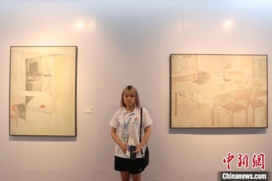 8月26日下午,廣東省廣州市,粵臺(tái)學(xué)子中華情——2023兩岸大學(xué)生文化藝術(shù)夏令營(yíng)啟動(dòng)儀式暨“融·合”兩岸大學(xué)生藝術(shù)交流展開幕式在廣東華僑博物館舉行。圖為臺(tái)灣學(xué)生在兩岸大學(xué)生藝術(shù)交流展作品前留影。吳善基攝
