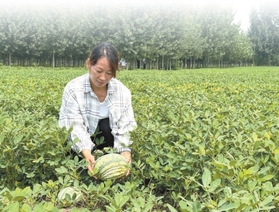魯小國的妻子肖利萍在西瓜花生套種的地里采摘西瓜。本報記者 王 者攝