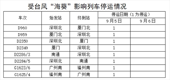 據(jù)中央氣象臺(tái)消息,今年第11號(hào)臺(tái)風(fēng)“??庇诮裉欤?月5日)早晨5點(diǎn)20分前后在福建省東山縣沿海登陸,福建東部部分地區(qū)將有大暴雨,并伴有短時(shí)強(qiáng)降水,局地有雷暴大風(fēng)等強(qiáng)對(duì)流天氣。為防范臺(tái)風(fēng)影響,保障鐵路運(yùn)輸安全,中國(guó)鐵路南昌局集團(tuán)有限公司繼續(xù)調(diào)整部分旅客列車運(yùn)行方案,停運(yùn)管內(nèi)途經(jīng)杭深線福州南至詔安,龍漳線龍巖至漳州,昌福線三明北至福州等區(qū)段旅客列車。同時(shí),加開(kāi)15趟旅客列車,方便旅客出行。