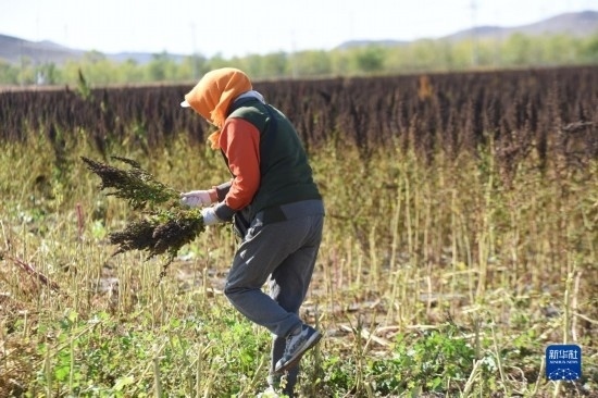 10月1日,在沽源縣白土窯鄉(xiāng)小西溝村,種植戶王秀梅在田間撿拾收割機(jī)收割后剩余的藜麥。