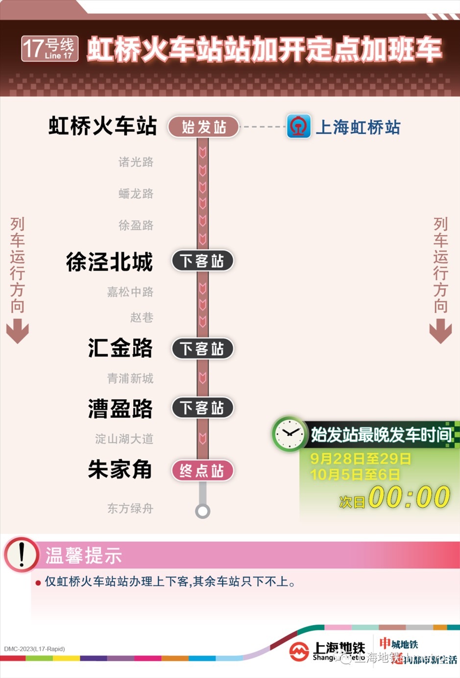 根據(jù)鐵路虹橋站夜間到達列車開行情況,9月28日、9月29日、10月5日、10月6日,鐵路在原夜間圖定計劃的基礎(chǔ)上增加了開行班次。為應(yīng)對鐵路臨時加開,做好虹橋火車站夜間列車集中到達大客流疏散工作,虹橋樞紐相關(guān)的地鐵2、10、17號線在既定延時或加開方案的基礎(chǔ)上進一步增開定點加班車。其中,9月28日至29日、10月5日至6日夜間,虹橋火車站定點加班車最晚發(fā)車時刻為:2號線至次日2:00、10號線至次日0:30、17號線至次日0:00。同時,9月30日至10月4日,2號線和10號線虹橋火車站定點加班車發(fā)車時刻推遲至次日0:20。