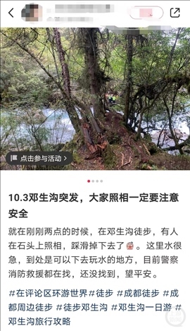 10月3日,游客艾女士(化名)發(fā)布圖片稱,當(dāng)天下午2點(diǎn)左右,在鄧生溝徒步,有人照相時(shí)踩滑掉落水里,水流非常湍急?!笆钦驹谑^上照相,踩滑了掉下去。聽到落水者兒子哭著給家里人打電話說的。”她還向上游新聞?dòng)浾弑硎?,落水者是一位女游客,事情發(fā)生后,警方、消防等都在展開救援。多位游客表示,該女游客已被找到,不過已經(jīng)去世。