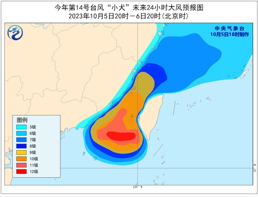 大風(fēng)預(yù)報(bào):5日20時(shí)至6日20時(shí),東海大部及釣魚島附近海域、巴士海峽西北部、臺灣海峽、南海東北部以及浙江沿海、福建沿海、廣東東部沿海、臺灣島北部沿海將有6-8級、陣風(fēng)9-10級的大風(fēng),其中巴士海峽西北部、臺灣海峽、南海東北部等地部分海域?qū)⒂?-10級、陣風(fēng)11-13級的大風(fēng),“小犬”中心經(jīng)過的附近海面風(fēng)力有11-13級,陣風(fēng)14-15級。