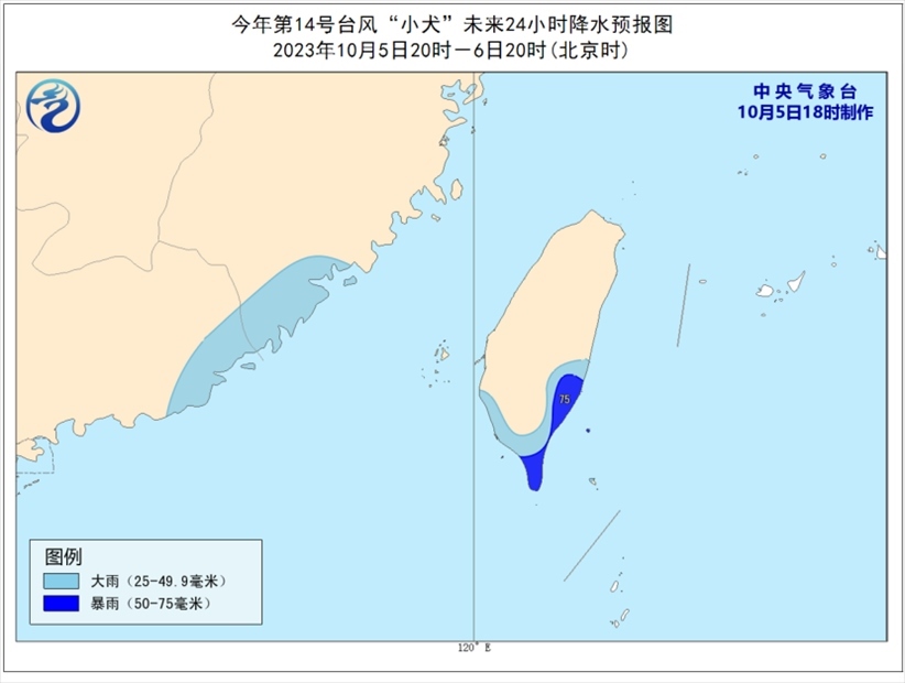 降水預(yù)報(bào):5日20時(shí)至6日20時(shí),臺灣島南部、福建東南部、廣東東北部等地將有大雨或暴雨(50-75毫米)。