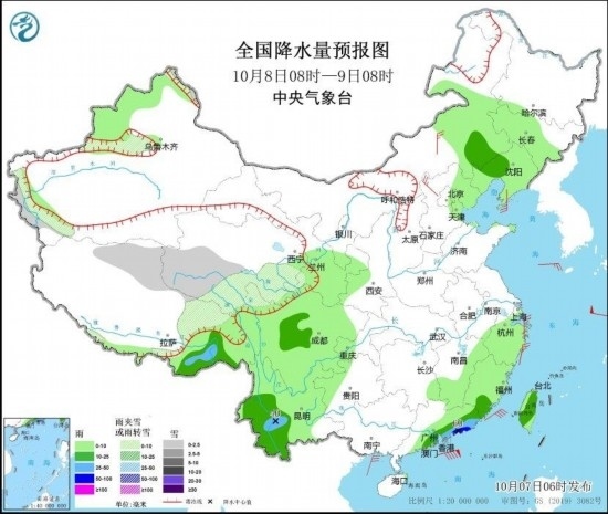 圖1 全國降水量預(yù)報圖(10月7日08時-8日08時)