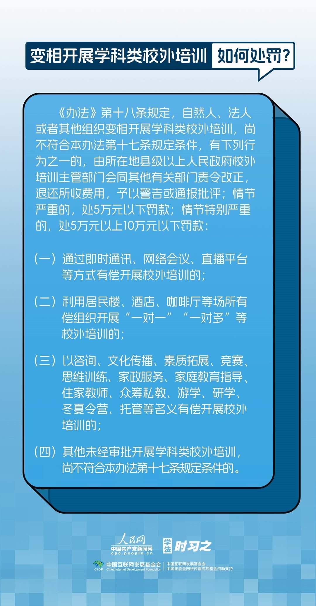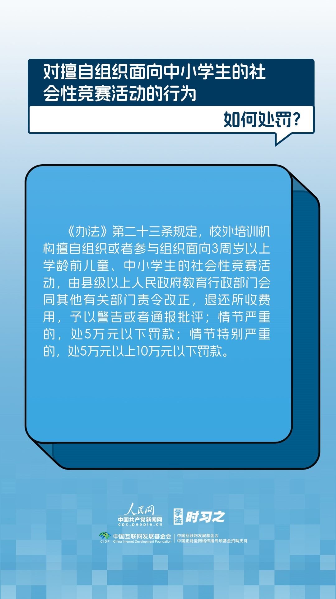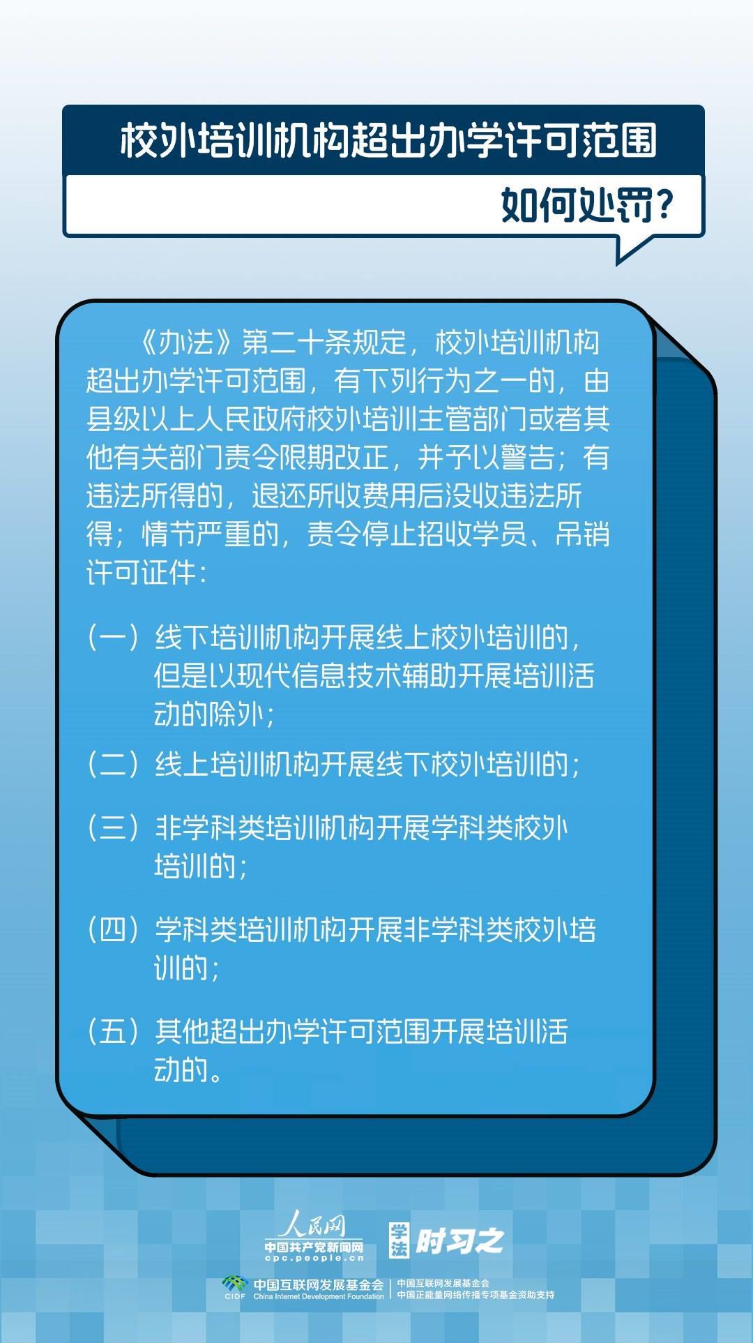 《校外培訓(xùn)行政處罰暫行辦法》(以下簡稱《辦法》)將于2023年10月15日起施行?!掇k法》提出了校外培訓(xùn)行政處罰總體要求。規(guī)定適用對象為面向社會招收3周歲以上學(xué)齡前兒童、中小學(xué)生,違法開展校外培訓(xùn)的自然人、法人或者其他組織。要求校外培訓(xùn)行政處罰應(yīng)當(dāng)遵循公正、公開的原則,堅持處罰與教育相結(jié)合,引導(dǎo)自然人、法人或者其他組織自覺守法,共同抵制校外培訓(xùn)違法行為,營造有利于學(xué)生成長成才的良好環(huán)境。