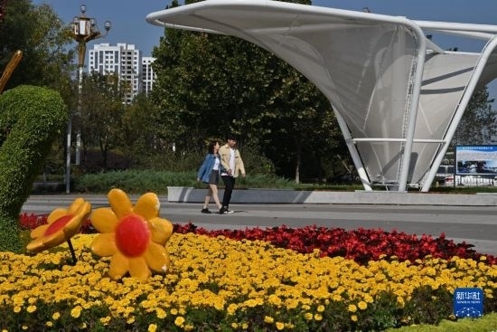 10月15日,市民從唐山市海港經(jīng)濟(jì)開(kāi)發(fā)區(qū)城市休閑驛站走過(guò)。