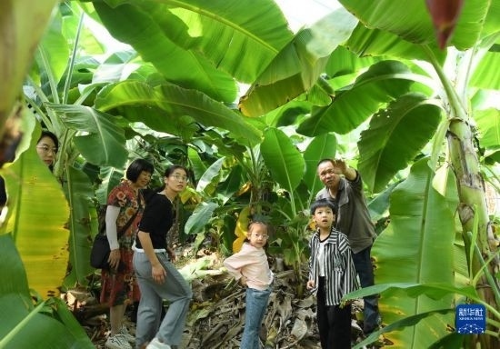 10月18日,在浬浦鎮(zhèn)陶姚村的香蕉大棚內(nèi),兒童在了解香蕉的生長習性。
