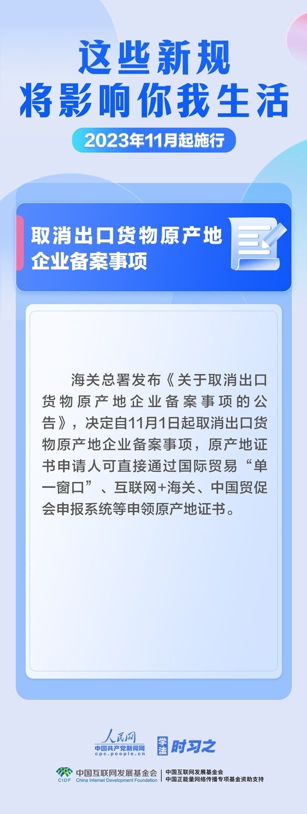 調(diào)整最高法知產(chǎn)法庭審理上訴案件范圍;簡化債券發(fā)行人員任職資格審批程序;取消出口貨物原產(chǎn)地企業(yè)備案事項(xiàng)……11月,這些新規(guī)施行,將影響你我生活。