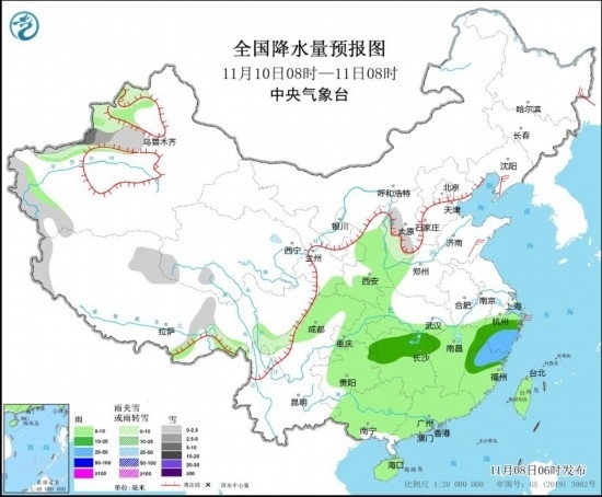 11月10日08時(shí)至11日08時(shí),新疆沿天山地區(qū)和南疆西部山區(qū)、山西中部等地部分地區(qū)有小到中雪或雨夾雪,局地大雪。西北地區(qū)東南部、江漢西部、江南、西南地區(qū)東部、華南、臺(tái)灣島等地部分地區(qū)有小到中雨,其中,浙江中南部、福建北部等地部分地區(qū)有大雨。遼東半島、山東南部等地部分地區(qū)有4~5級(jí)風(fēng)(見(jiàn)圖4)。