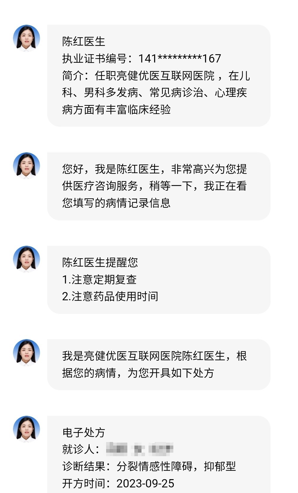 不僅是問診環(huán)節(jié)存在問題,開處方環(huán)節(jié)也有漏洞。記者發(fā)現(xiàn),一家名為“亮健好藥網(wǎng)”的企業(yè),在銷售抗抑郁類藥物“米氮平”“百憂解”等藥物時,其他平臺都需要上傳處方照片進(jìn)行審核,而記者多次上傳不同樣式的風(fēng)景照,每次都會跳出來一位“亮健優(yōu)醫(yī)互聯(lián)網(wǎng)醫(yī)院陳紅醫(yī)生”接診,根據(jù)介紹,她在兒科、男科多發(fā)病、常見病診治、心理疾病方面有豐富臨床經(jīng)驗(yàn)。根據(jù)記者上傳的風(fēng)景照,陳醫(yī)生瞬間開具了電子處方,并進(jìn)入了藥師審核階段。隨后記者取消訂單,并在不同時間,多次嘗試上傳風(fēng)景照,發(fā)現(xiàn)每次都是這位陳紅醫(yī)生瞬間開方。雖然后續(xù)亮健平臺藥師都會致電記者要求補(bǔ)充處方才能開藥,但這位陳紅醫(yī)生卻總能第一時間看著風(fēng)景照“秒開處方”。