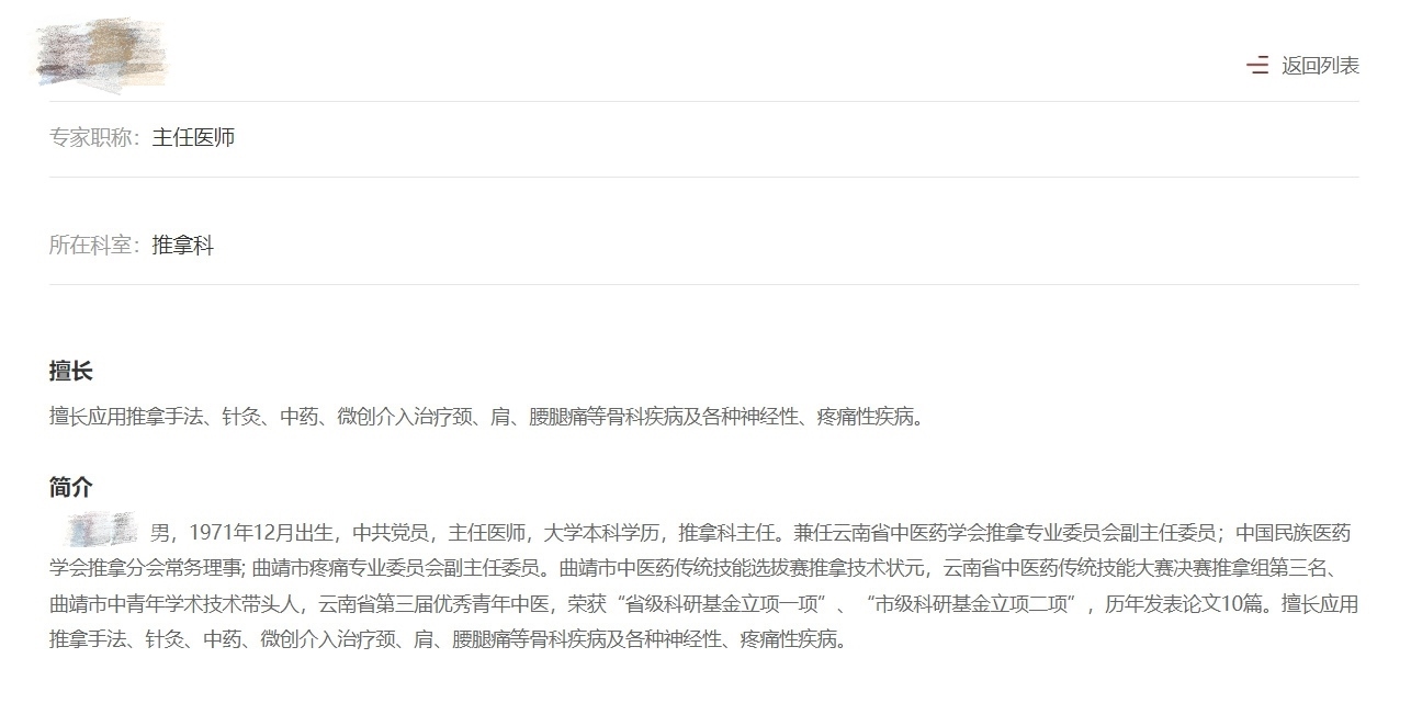 而在曲靖中醫(yī)醫(yī)院官網(wǎng)上,張樹昆醫(yī)生的簡介為:推拿科主任醫(yī)師,擅長應(yīng)用推拿手法、針灸、中藥、微創(chuàng)介入治療肩、頸、腰腿等骨科疾病及各種神經(jīng)性、疼痛性疾病。