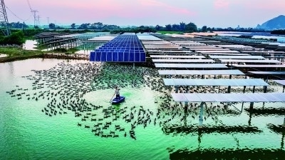 在廣西壯族自治區(qū)南寧市上林縣白圩鎮(zhèn)登山村,養(yǎng)殖戶在光伏板旁給鴨子喂食。“漁光互補”拓寬了當?shù)刂赂辉鍪盏那?。潘永攝