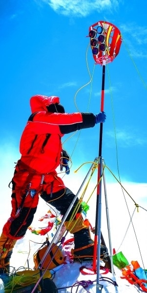 “2020珠峰高程測量登山隊”成功登頂世界第一高峰珠穆朗瑪峰,隊員在峰頂開展測量工作。扎西次仁攝