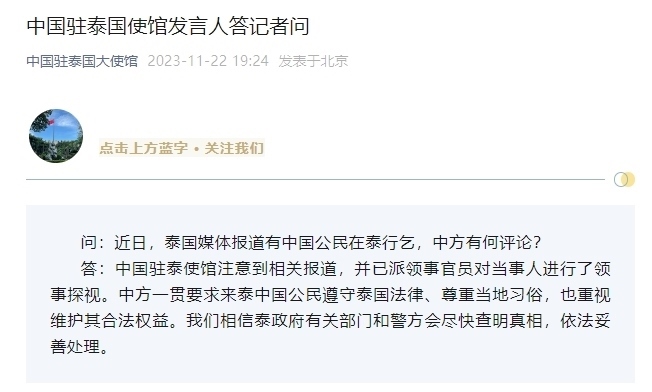 ·中國駐泰國大使館回應(yīng)網(wǎng)傳有中國公民在泰行乞:注意到相關(guān)報(bào)道,并已派領(lǐng)事官員對(duì)當(dāng)事人進(jìn)行了領(lǐng)事探視。
