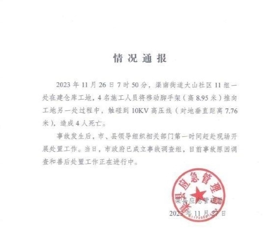 ·四川達(dá)州發(fā)生觸電安全事件造成4人死亡,當(dāng)?shù)貞?yīng)急管理局通報(bào):4名工人移動(dòng)腳手架碰高壓線身亡。