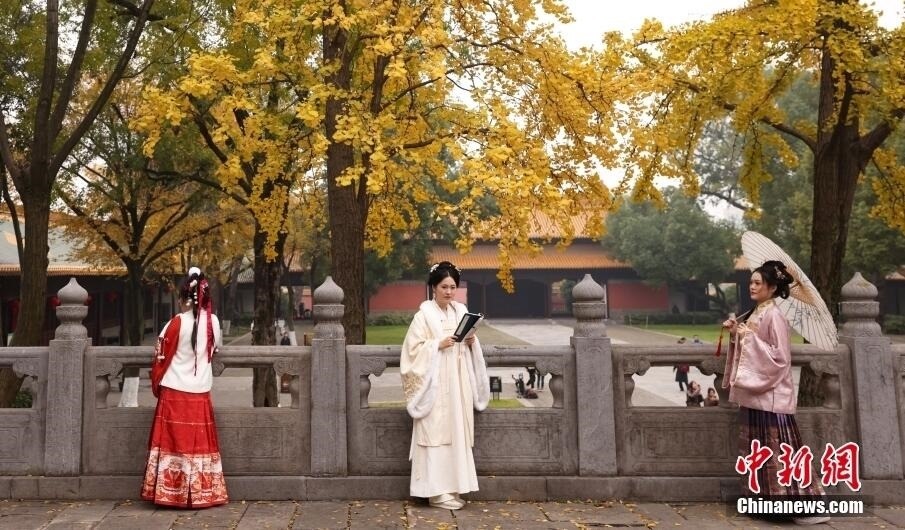 近日,南京朝天宮內(nèi)的古銀杏披上“金甲”,與古樸的建筑相映襯,增添了一份“詩(shī)情畫意”。圖為民眾在古銀杏樹下拍攝照片。