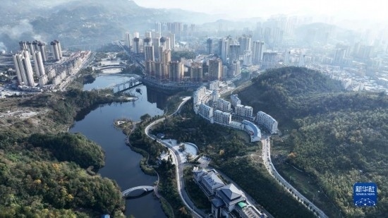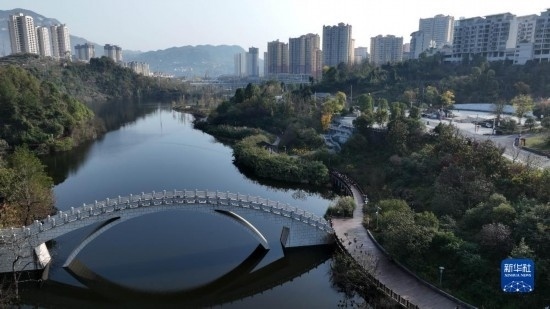 11月29日拍攝的貴州省遵義市正安縣濕地公園與民居一景(無(wú)人機(jī)照片)。