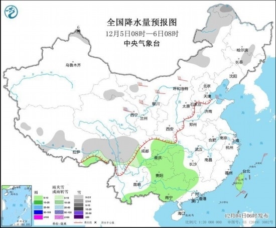 12月4日08時至5日08時,新疆北部、甘肅河西、青海南部、西藏中東部和南部、川西高原北部等地部分地區(qū)有小到中雪或雨夾雪,其中,新疆阿勒泰山區(qū)和伊犁河谷、西藏南部等地部分地區(qū)有大到暴雪,局地大暴雪(20~22毫米)。湖南南部、江西南部、浙江大部、福建、廣東東部和北部、廣西西部、云南南部、海南島、臺灣島等地部分地區(qū)有小到中雨,其中,臺灣島中南部等地部分地區(qū)有大雨(25~40毫米)。新疆北疆北部、內(nèi)蒙古大部、甘肅河西等地部分地區(qū)有4~6級風。