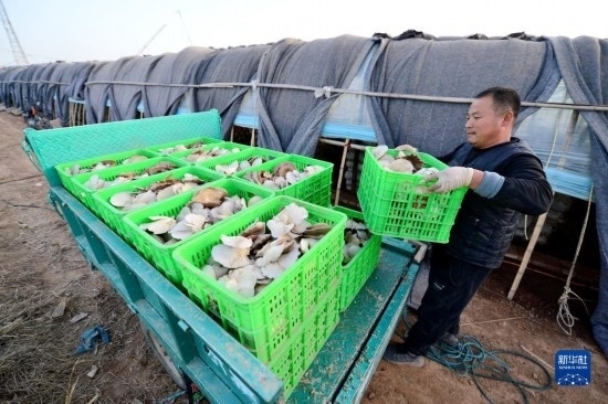 12月6日,在邯鄲市肥鄉(xiāng)區(qū)毛演堡鎮(zhèn)路堡村,菇農(nóng)在搬運菌菇。