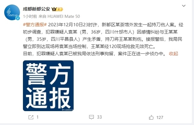 ·成都新都區(qū)一茶館外發(fā)生持刀傷人案,警方通報(bào):系因感情糾紛,致一人死亡。