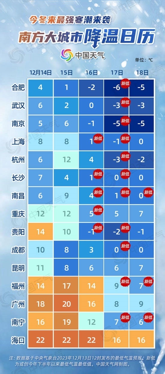 從中國(guó)天氣網(wǎng)推出的南方大城市降溫日歷來(lái)看,未來(lái)五天,合肥、武漢、南京、上海、杭州、貴陽(yáng)最低氣溫都將逐步下降到冰點(diǎn)以下。南昌16日至18日最低氣溫或連創(chuàng)新低,貴陽(yáng)最低氣溫將從14℃降至-2℃,降幅可達(dá)16℃。