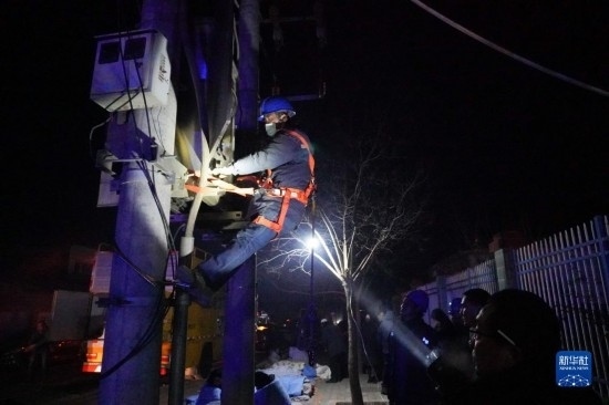12月19日,在甘肅省臨夏回族自治州積石山保安族東鄉(xiāng)族撒拉族自治縣中西醫(yī)結(jié)合醫(yī)院門(mén)口,電力部門(mén)工作人員搶修電力設(shè)施。