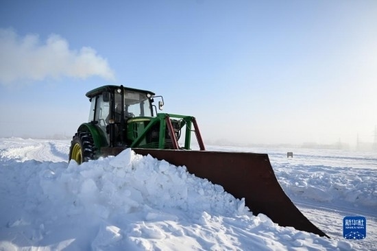 12月19日,在內(nèi)蒙古呼倫貝爾市鄂溫克族自治旗伊敏蘇木,工作人員駕駛大型機(jī)械清理牧區(qū)道路積雪。