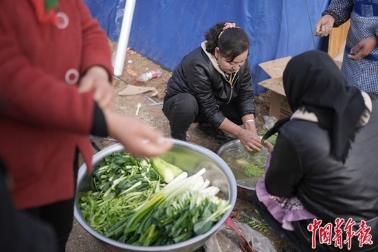 12月20日下午,青海省海東市民和縣中川鄉(xiāng)金田村,在救助點準備飯菜的婦女。中青報·中青網記者 李雋輝/攝
