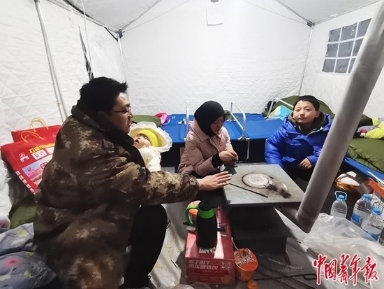 12月19日晚,甘肅省積石山縣大河家鎮(zhèn)一處安置點,30歲的馬繼云一家在安置點帳篷里烤火爐。當天他們收到了政府和愛心企業(yè)提供的生活物資,把一家人的生活安頓了下來。中青報·中青網記者 馬富春/攝