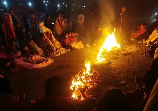 12月19日凌晨,積石山縣高關初級中學的學生圍坐烤火。受訪者供圖