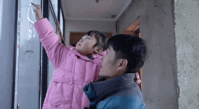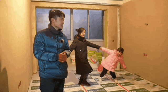 一家三口在還未裝修完的房子里奔跑嬉戲