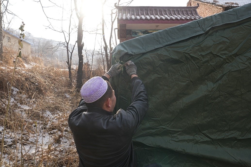 12月20日,馬國忠一家回到村里,拿塑料布在家附近搭了個簡易帳篷,兩根木頭、一條橫梁支起來,怕煙筒把塑料烤化,帳篷里不能烤火,頂多防風(fēng),但馬國忠覺得比車?yán)飶?qiáng)多了。家里的電熱毯拿出來鋪上,他才睡了個安穩(wěn)覺。只是半夜來了余震,又醒了。他止不住想:下一步怎么辦?后面會不會繼續(xù)搖?他家鋼管焊的牛棚頂晃得“乒乒乓乓”響。