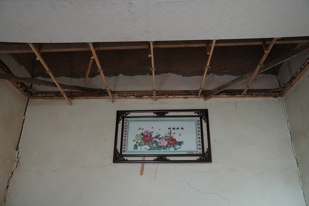12月23日當(dāng)天,馬國忠和叔叔伯伯兩家都在家門前搭起剛領(lǐng)的帳篷。叔叔馬進(jìn)明家受損嚴(yán)重,兩堵磚墻的銜接處完全開裂,像條拉鏈被猛地拽下;天花板掉了大半,木頭架構(gòu)的屋頂赫然露在豁口里。所幸,他和家人平時在縣城租房住。