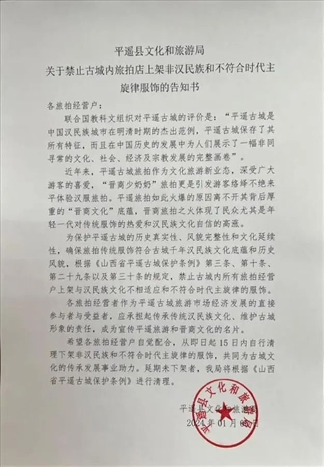 ·平遙古城禁止旅拍店上架非漢民族服飾?當?shù)匚穆镁只貞?yīng):目前已刪除該告知書。