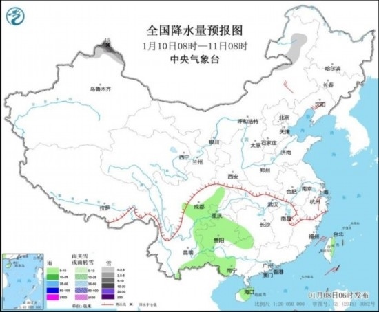 全國(guó)降水量預(yù)報(bào)圖(1月10日08時(shí)-11日08時(shí)) 來源:中央氣象臺(tái)網(wǎng)站